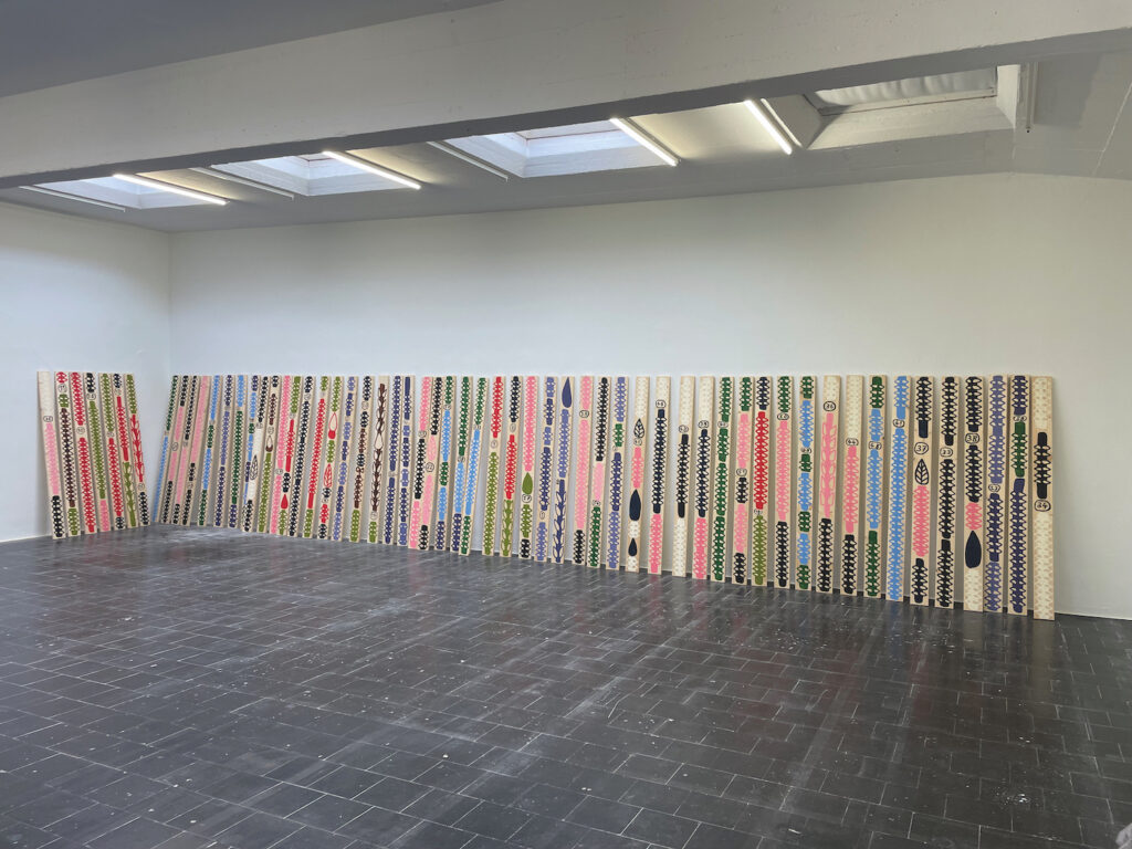 The respective floorboards can be picked up for a nominal fee of 60 euros on the last weekend of the exhibition. From November 20 to 23, the wooden floorboards will be arranged standing on the wall between the paintings and photographs. A list for reservations is available at the exhibition. The proceeds from the nominal fee will go toward financing the exhibition.