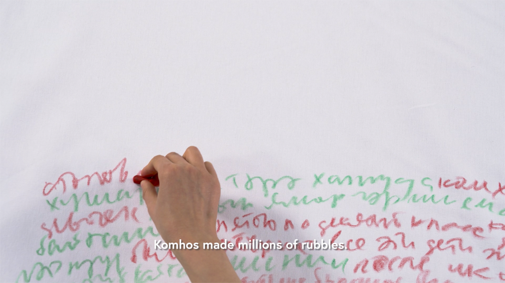 In The River I Grew Up With, Natalia Papaeva recalls, in a dialogue with her mother, the landscape surrounding the East Siberian village of Orlik and the stories interwoven with family memories. Mixing the Buryat and Russian languages, they talk as a duo about their village, Soviet history, anecdotes from the neighborhood, and ghost stories. The bilingual is conveyed in their conversation both acoustically through two sound tracks and visually through a shared text of Russian and Buryat words in red and green. Through family interaction, the artist maps out a fragmentary verbal map, allowing us to experience a landscape in the process of dissolution and its changing culture.
