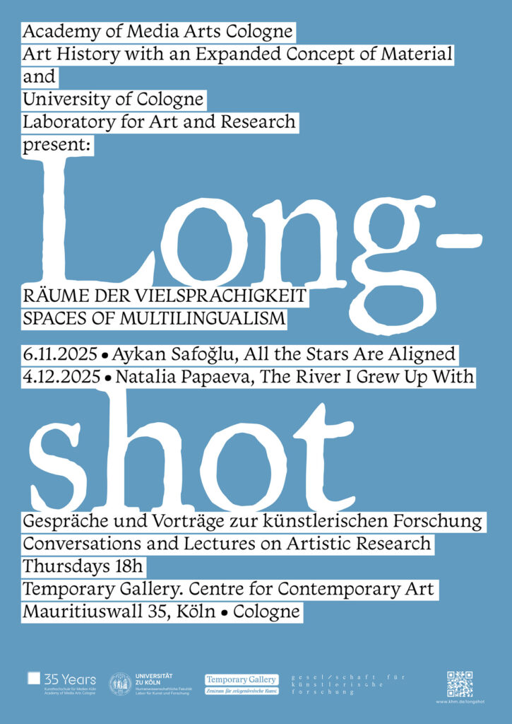 Public talks and lectures on artistic research – presented by the Academy of Media Arts (Art History with an Expanded Concept of Material), the University of Cologne (Laboratory for Art & Research), the Society for Artistic Research in Germany (gfkd), and Temporary Gallery, Cologne.